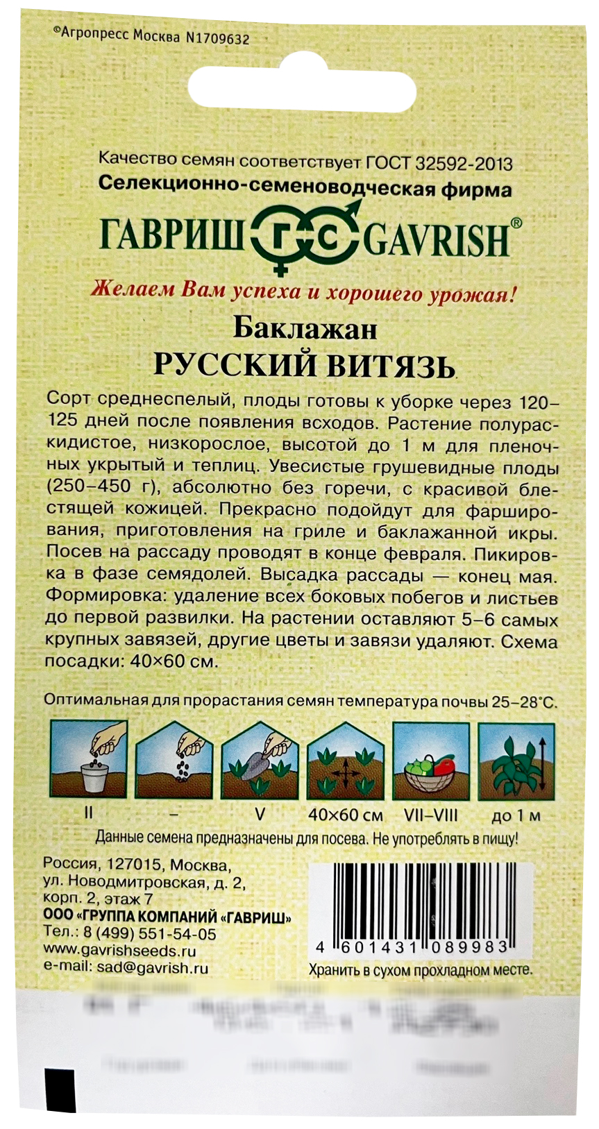 Баклажан Русский витязь ГАВРИШСорт среднеспелый, плоды готовы к уборке через 120-125 дней после появления всходов. Растение полураскидистое, низкорослое, высотой до 1 м для пленочных укрытый и теплиц. Увесистые грушевидные плоды (250-450 г), абсолютно без горечи, с красивой блестящей кожицей. Прекрасно подойдут для фарширования, приготовления на гриле и баклажанной икры. Посев на рассаду проводят в конце февраля. Пикировка в фазе семядолей. Высадка рассады — конец мая. Формировка: удаление всех боковых побегов и листьев до первой развилки. На растении оставляют 5-6 самых крупных завязей, другие цветы и завязи удаляют. Схема посадки: 40х60 см.