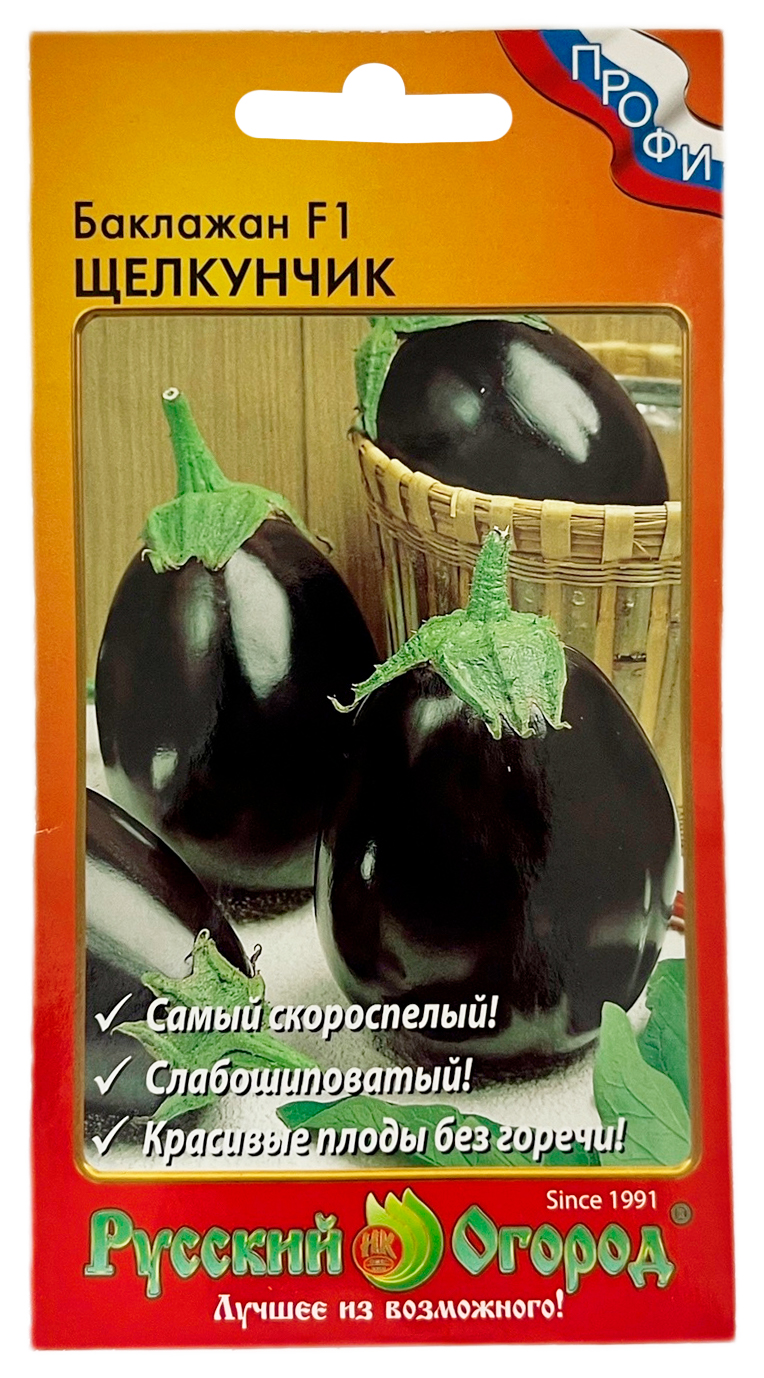 Баклажан ЩЕЛКУНЧИК Русский ОгородБаклажан Щелкунчик F1 - скороспелый и неприхотливый сорт! С момента высадки рассады до полного созревания плодов проходит 45 дней. Всего 1,5 месяца – и вас ждет первый урожай! Баклажан Щелкунчик F1 дает урожай в несколько этапов, все новые плоды образуются в верхней части куста. Плод в среднем весит 250 грамм, а его средняя длина – от 12 до 14 см. Форма плода очень изящная, каплевидная. Плоды отлично хранятся длительное время, не становятся рыхлыми, хорошо переносят транспортировку. Идеальный сорт для посадки на даче!