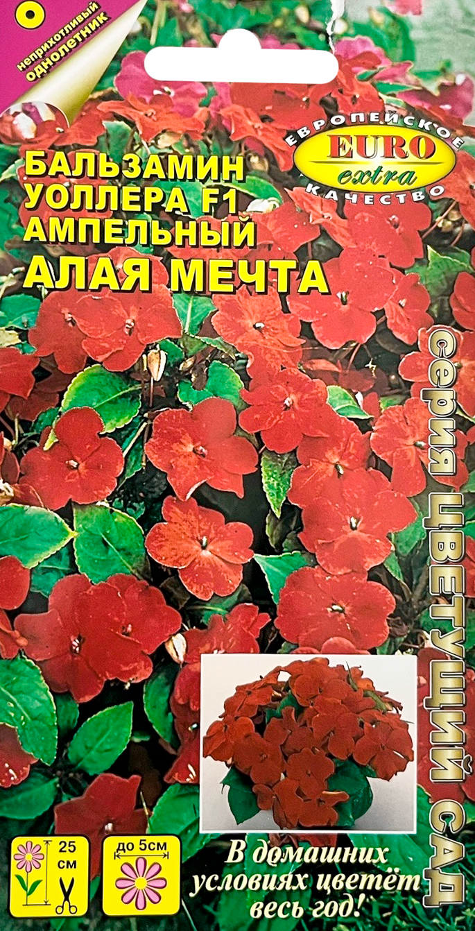 Бальзамин Алая мечта (ампула)Восхитительное однолетнее ампельное и почвопокровное растение. Куст компактный с большим количеством побегов, многочисленными крупными (до 6 см в диаметре) цветками на растении. Гибрид отличается высокой устойчивостью к неблагоприятным условиям, и длительным (с июня до осени) обильным цветением. Яркие алые цветы станут потрясающим украшением Ваших кашпо, балконов, садовых вазонов и комнатных композиций. Незаменим бальзамин и в саду, в легкой полутени под деревьями, на рабатках, клумбах и бордюрах. В домашних условиях Вы сможете наслаждаться цветением этого удивительного растения круглый год. Посев: на рассаду в феврале - марте в хорошо увлажненную почву на глубину не более 0,5 см, закрывают стеклом или пленкой и содержат при +18+22°С. Семена прорастают в течение двух-трех недель. Затем температуру понижают до +16+ 18°С и убирают стекло. Зацветает через 9-10 недель после сева. Для получения крепкой, здоровой рассады необходимо дополнительное освещение и повышенная влажность.