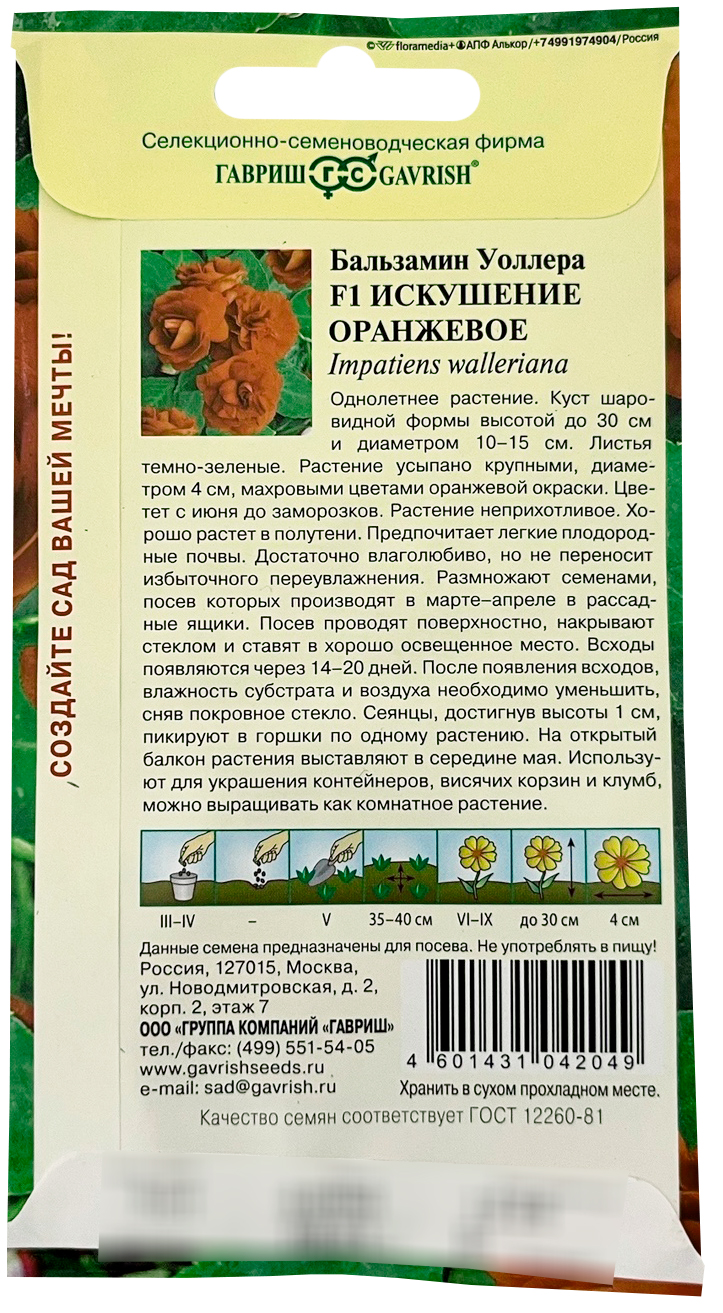 Бальзамин Искушение оранжевое Уоллера F1Однолетнее растение. Куст шаровидной формы высотой 25-30 см и диаметром 10-15 см. Листья темно-зеленые. Растение усыпано крупными, диаметром 4 см, махровыми цветами оранжевой окраски. Цветет с июня до заморозков. Растение неприхотливое. Хорошо растет в полутени. Предпочитает легкие плодородные почвы. Достаточно влаголюбиво, но не переносит избыточного переувлажнения. Размножают семенами, посев которых производят в марте-апреле в рассадные ящики. Посевы засыпают влажным песком слоем 3 мм и поддерживают постоянную влажность, для чего емкость накрывают стеклом и ставят в хорошо освещенное место. Всходы появляются через 14-20 дней. После появления всходов, влажность субстрата и воздуха необходимо уменьшить, сняв покровное стекло. Сеянцы, достигнув высоты 1 см, пикируют в горшки по одному растению. На открытый балкон растения выставляют в середине мая. Используют для украшения контейнеров, висячих корзин и клумб, можно выращивать как комнатное растение.