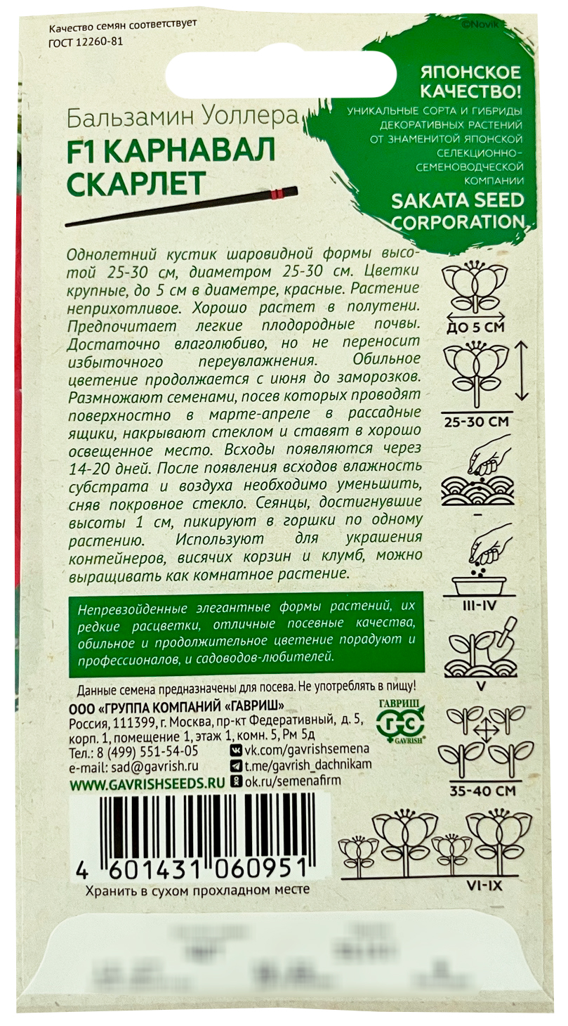 Бальзамин Карнавал Скарлет Уоллера F1 СакатаКомпактный куст высотой 25-30 см, диаметром 25-30 см. Цветки красные, диаметром 5 см. Хорошо растет в полутени. Обильно цветет. Влаголюбив, но не переносит переувлажнения. Для клумб, кашпо и цветников. Можно выращивать как комнатное растение.