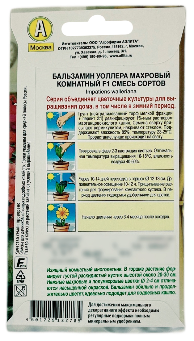 Бальзамин УОЛЛЕРА махровый комнатный F1 смесь АЭЛИТАСерия объединяет цветочные культуры для выращивания дома, в том числе в зимний период. Изящный комнатный многолетник. В горшке растение формирует густой раскидистый кустик высотой около 20-30 см. Нежные махровые и полумахровые цветки диаметром 2-4 см отличаются насыщенной окраской. Бальзамин обильно и продолжительно цветет, идеально подойдет для подвесных кашпо.