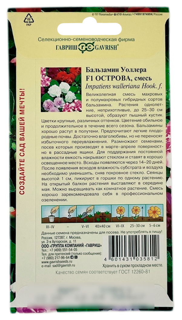 Бальзамин Уоллера F1 ОСТРОВА смесь ГАВРИШВеликолепная смесь махровых и полумахровых гибридных сортов бальзамина. Растения однолетние, неприхотливые, до 25-30 см высотой, образуют пышный кустик. Цветки крупные, различных оттенков. Цветение обильное и продолжительное в течение всего сезона. Бальзамины хорошо растут в полутени. Предпочитают легкие плодородные почвы. Достаточно влаголюбивы, но не переносят избыточного переувлажнения. Размножают семенами, посев производят в марте-апреле в рассадные ящики. Посевы засыпают влажным песком слоем 3 мм и поддерживают постоянную влажность, для чего емкость накрывают стеклом и ставят в хорошо освещенное место. Всходы появляются через 14-20 дней. После появления всходов влажность субстрата и воздуха необходимо уменьшить, сняв покровное стекло. Сеянцы высотой 1 см, пикируют в горшки по одному растению. На открытый балкон растения выставляют в середине мая. Можно выращивать как комнатное растение. Смесь хорошо зарекомендовала себя в профессиональном озеленении.