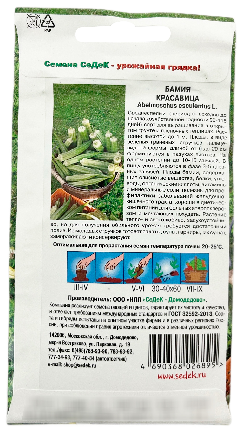 Бамия Красавица СеДеКСреднеспелый (период от всходов до начала хозяйственной годности 90-115 дней) сорт для выращивания в открытом грунте и пленочных теплицах. Растение высотой до 1 м. Плоды, в виде зеленых граненых стручков пальцевидной формы, длиной от 6 до 20 см формируются в пазухах листьев. На одном растении до 10-15 завязей. В пищу употребляются в фазе 3-5 дневных завязей. Плоды бамии, содержащие слизистые вещества, белки, углеводы, органические кислоты, витамины и минеральные соли, полезны для профилактики заболеваний желудочно-кишечного тракта, хороши в диетическом питании для больных атеросклерозом и мечтающих похудеть. Растение тепло и светолюбиво, засухоустойчиво, но для получения обильного урожая требуется достаточный полив. Из молодых стручков готовят салаты, супы, гарниры, их сушат, замораживают и консервируют.
