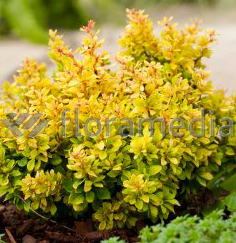 Барбарис Тунберга Голдалита Berberis thunbergii Goldalita Компактный кустарник. Крона округлая. Листья лимонно-желтого цвета. Особенно декоративно выглядит осенью с красными плодами на желтом фоне листвы.Характеристики