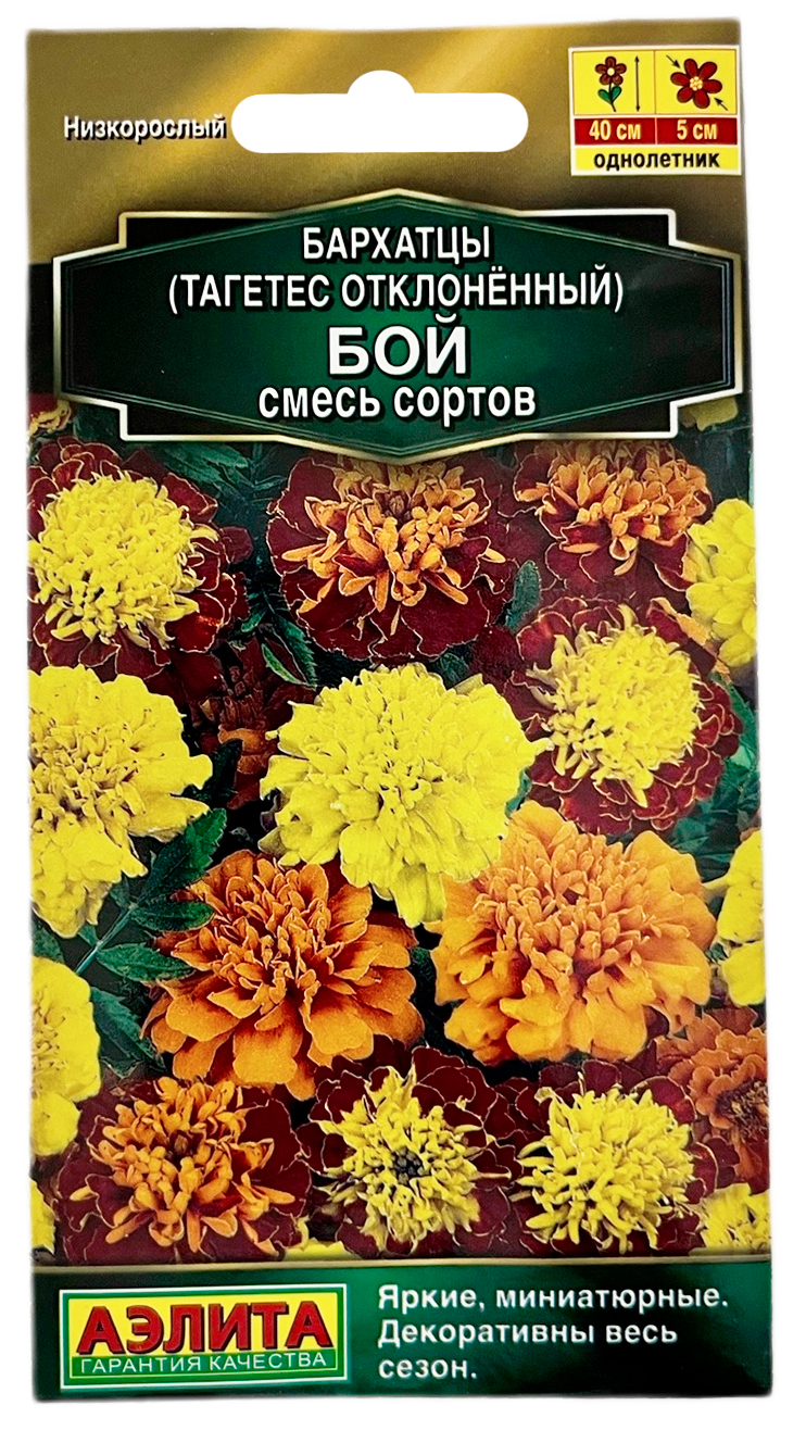 Тагетес отклонённый БАРХАТЦЫ БОЙ СМЕСЬ сортов АЭЛИТАРоссыпь ярких огоньков, которая оживит ваш сад, украсит балконы и окна! Главное достоинство этой смеси бархатцев иностранной селекции – это низкорослый кустик, высотой* 30-40 см, с сильным ветвлением и способнотью сохранять декоративность в течение всего сезона. Соцветия махровые, бархатистые, 4-5 см. Благодаря своей неприхотливости, бархатцы прекрасно растут в контейнерах, корзинах и оконных ящиках. Смесь великолепно подойдет для оформления клумб, бордюров, рабаток, подбивки более крупных растений.