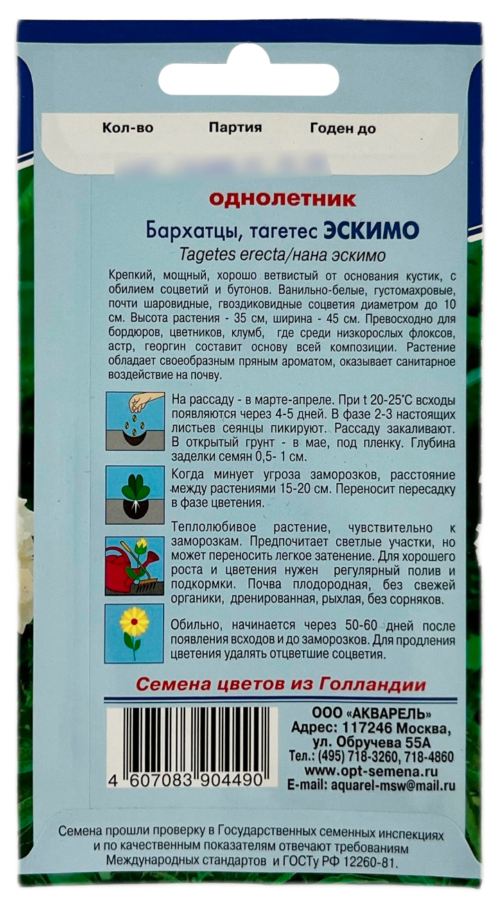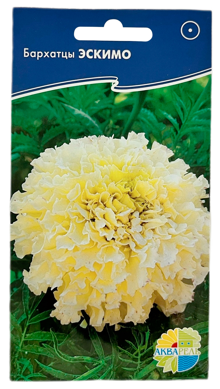 Бархатцы ЭСКИМО АКВАРЕЛЬКрепкий, мощный, хорошо ветвистый кустик с обилием бутонов и соцветий. Ванильно-белые, густомахровые, почти шаровидные соцветия до 10 см. Высота растения - 35 см, ширина - 45 см. Превосходно для для бордюров, цветников, клумб, где среди флоксов, циний, астр, георгин составит основу всей композиции. Растение обладает своеобразным пряным ароматом, оказывает санитарное воздействие на почву.
