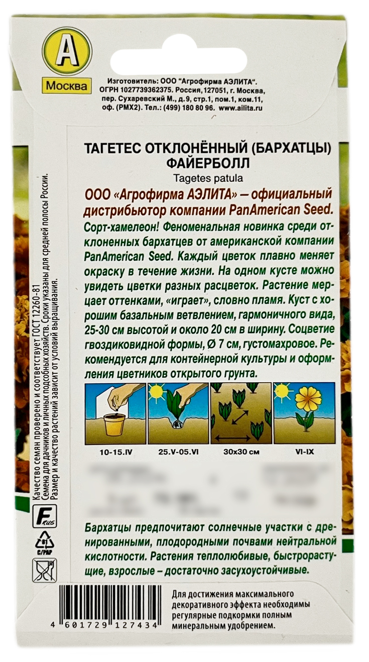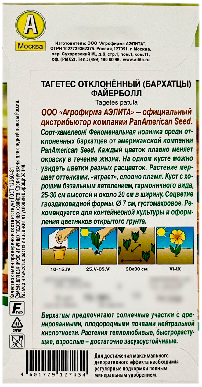 Тагетес отклонённый бархатцы ФАЙЕРБОЛЛ АЭЛИТАСорт-хамелеон! Феноменальная новинка среди отклоненных бархатцев. Каждый цветок плавно меняет окраску в течение жизни. На одном кусте можно увидеть цветки разных расцветок. Растение мерцает оттенками, «играет», словно пламя. Куст с хорошим базальным ветвлением, гармоничного вида, 25-30 см высотой и около 20 см в ширину. Соцветие гвоздиковидной формы, Ø 7 см, густомахровое. Рекомендуется для контейнерной культуры и оформления цветников открытого грунта. Инкрустированные семена очищены от хохолков.