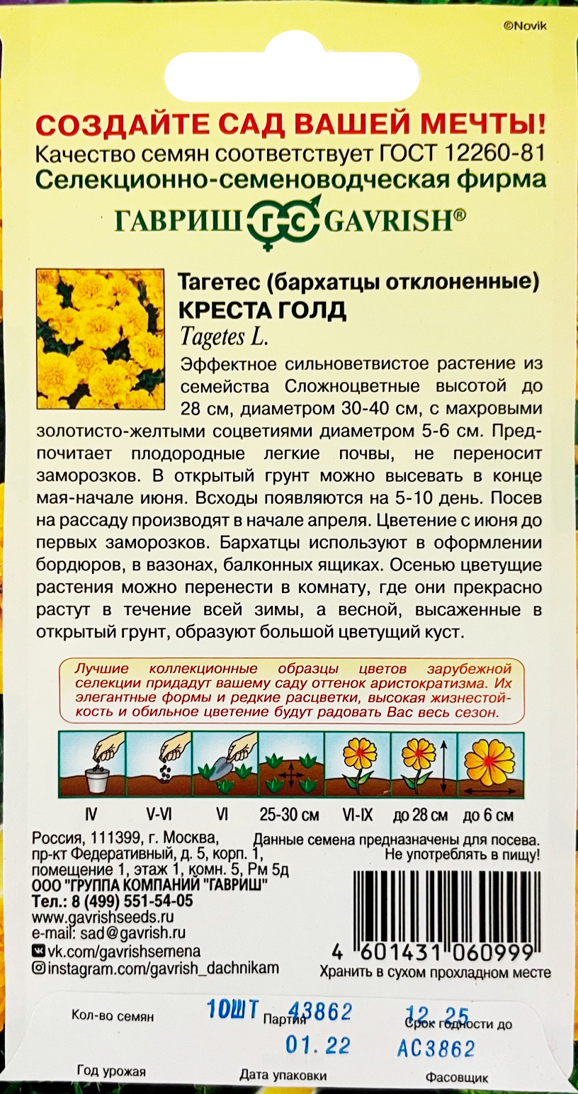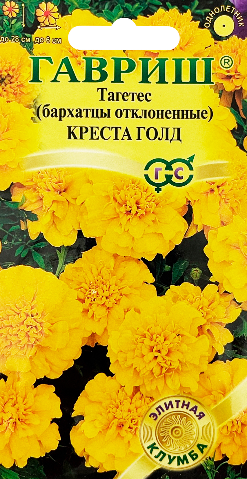 Тагетес (бархатцы отклоненные) Креста Голд 10 шт. серия Элитная клумбаЭффектный ветвистый куст высотой 23-28 см, диаметром 30-40 см. Соцветия золотисто-желтые, диаметром 5-6 см. Светолюбивы, теплолюбивы, заморозков не переносят. Предпочитают плодородные легкие почвы. Для оформления бордюров, рабаток, вазонов и балконных ящиков.