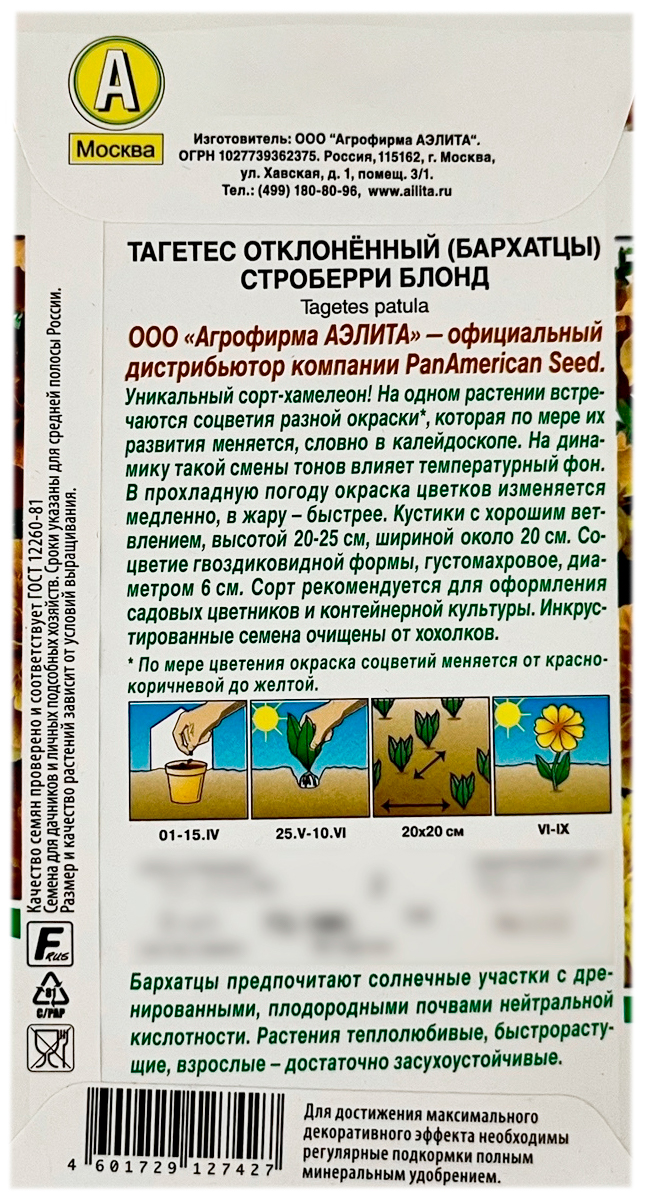 Тагетес отклонённый бархатцы СТРОБЕРРИ БЛОНД АЭЛИТАУникальная новинка – сорт-хамелеон! На одном кусте можно увидеть соцветия разной окраски. Вид растения меняется, как в калейдоскопе. На динамику смены тонов влияет температурный фон. В прохладную погоду окраска цветков меняется медленно, при повышении температуры – ускоряется. Куст с хорошим ветвлением, 20-25 см высотой и около 20 см в ширину. Соцветие гвоздиковидной формы, Ø 6 см, густомахровое. Рекомендуется для оформления садовых цветников и контейнерной культуры. Инкрустированные семена очищены от хохолков.
