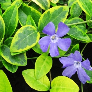 Барвинок малый Блю энд Голд Vinca minor Blue and Gold Хороший почвопокровник. Цветение с мая по сентябрь синими цветками. Лист жёлто-зелёный, широко-ланцетный, с жёлтой каймойХарактеристики