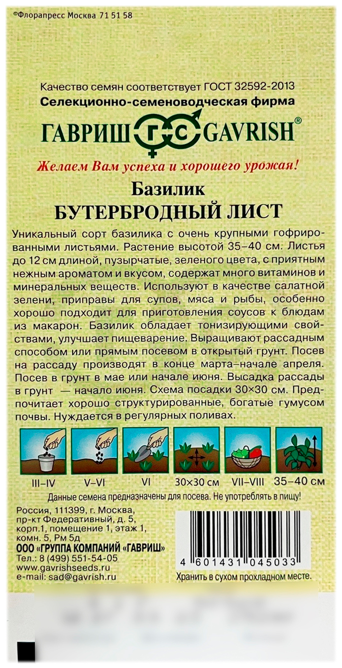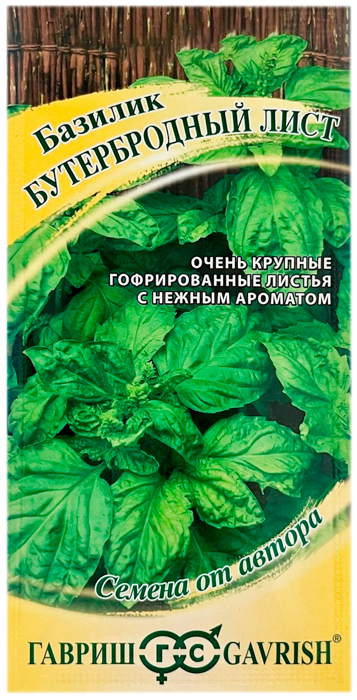 Базилик Бутербродный лист ГАВРИШУникальный сорт базилика с очень крупными гофрированными листьями. Растение высотой 35-40 см. Листья до 12 см длиной, пузырчатые, зеленого цвета, с приятным нежным ароматом и вкусом, содержат много витаминов и минеральных веществ. Используют в качестве салатной зелени, приправы для супов, мяса и рыбы, особенно хорошо подходит для приготовления соусов к блюдам из макарон. Базилик обладает тонизирующими свойствами, улучшает пищеварение. Выращивают рассадным способом или прямым посевом в открытый грунт. Посев на рассаду производят в конце марта – начале апреля. Посев в грунт в мае или начале июня. Высадка рассады в грунт – начало июня. Схема посадки 30x30 см. Предпочитает хорошо структурированные, богатые гумусом почвы. Нуждается в регулярных поливах.