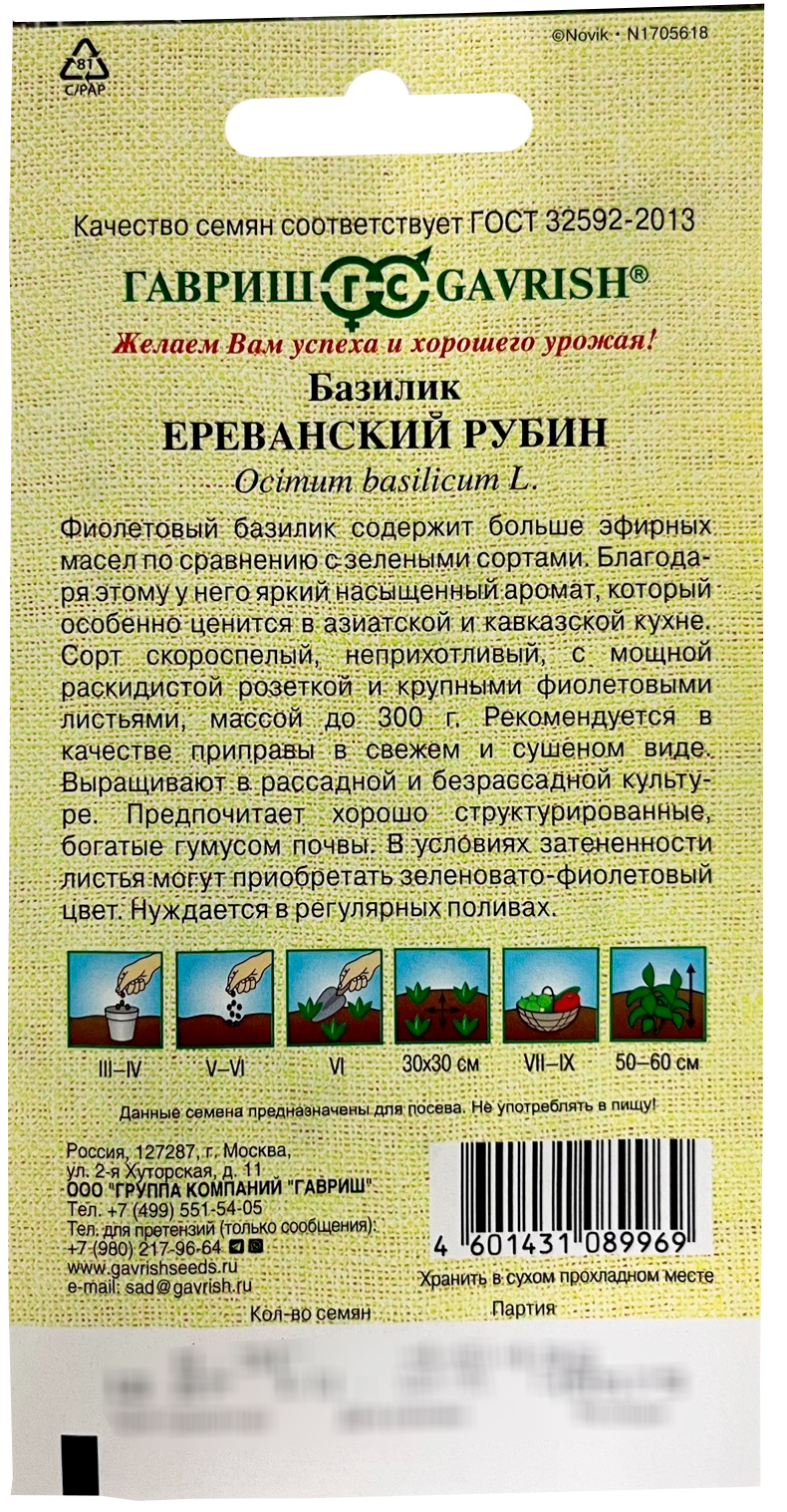 Базилик Ереванский рубин ГАВРИШФиолетовый базилик содержит больше эфирных масел по сравнению с зелеными сортами. Благодаря этому у него яркий насыщенный аромат, который особенно ценится в азиатской и кавказкой кухне. Сорт скороспелый, неприхотливый, с мощной раскидистой розеткой и крупными фиолетовыми листьями, массой до 300 г. Рекомендуется в качестве приправы в свежем и сушеном виде. Выращивают в рассадной и безрассадной культуре. Предпочитает хорошо структурированные, богатые гумусом почвы. Нуждается в регулярных поливах.