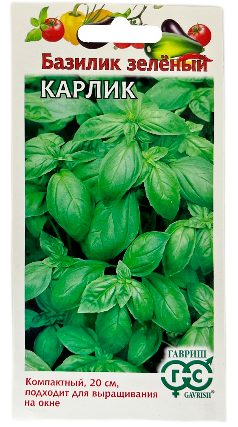 Базилик КАРЛИК зелёный ГАВРИШРастение раннеспелое, прямостоячее, высотой до 20 см, компактное, побеги полуприподнятые, с большим количеством листьев. Лист среднего размера, зеленый, яйцевидной формы, содержит много витаминов и минеральных веществ, с гвоздично-перечным ароматом. Используется в свежем виде в качестве салатной зелени и пряновкусовой добавки, а также натурального ароматизатора в кулинарии и при консервировании. Выращивается в рассадной и безрассадной культуре. Посев на рассаду производят в конце марта – начале апреля. Посев в грунт — в мае или начале июня. Высадка рассады в грунт – в начале июня.