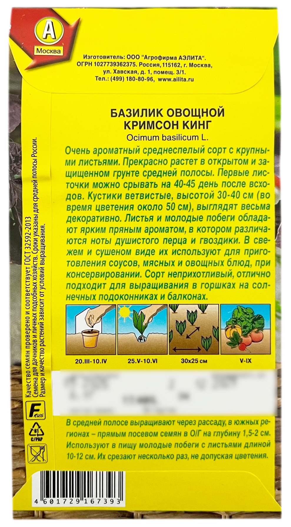 Базилик овощной КРИМСОН КИНГ АЭЛИТАОчень ароматный среднеспелый сорт с крупными листьями. Прекрасно растет в открытом и защищенном грунте средней полосы. Первые листочки можно срывать на 40-45 день после всходов. Кустики ветвистые, высотой 30-40 см (во время цветения около 50 см), выглядят весьма декоративно. Листья и молодые побеги обладают ярким пряным ароматом, в котором различаются ноты душистого перца и гвоздики. В свежем и сушеном виде их используют для приготовления соусов, мясных и овощных блюд, при консервировании. Сорт неприхотливый, отлично подходит для выращивания в горшках на солнечных подоконниках и балконах.