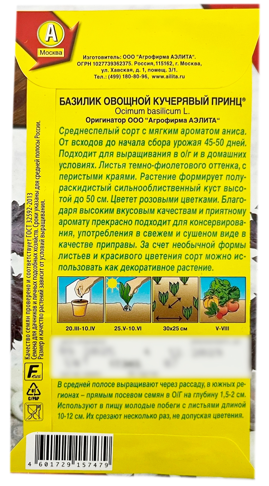 Базилик овощной КУЧЕРЯВЫЙ ПРИНЦ АЭЛИТАРаннеспелый сорт с мягким ароматом аниса. Период от всходов до цветения – 45-50 дней. Подходит для выращивания в открытом грунте и в домашних условиях. Листья темно-фиолетового оттенка с перистыми краями. Растение формирует полураскидистый, сильно облиственный куст, высотой до 50 см. Цветет розовыми цветками. Благодаря высоким вкусовым качествам и приятному аромату, прекрасно подходит для употребления в свежем виде, консервирования, а также в сушеном виде в качестве вкусовой добавки. В сочетании с необычной формой листьев и красивым цветением, сорт можно использовать как декоративное растение.