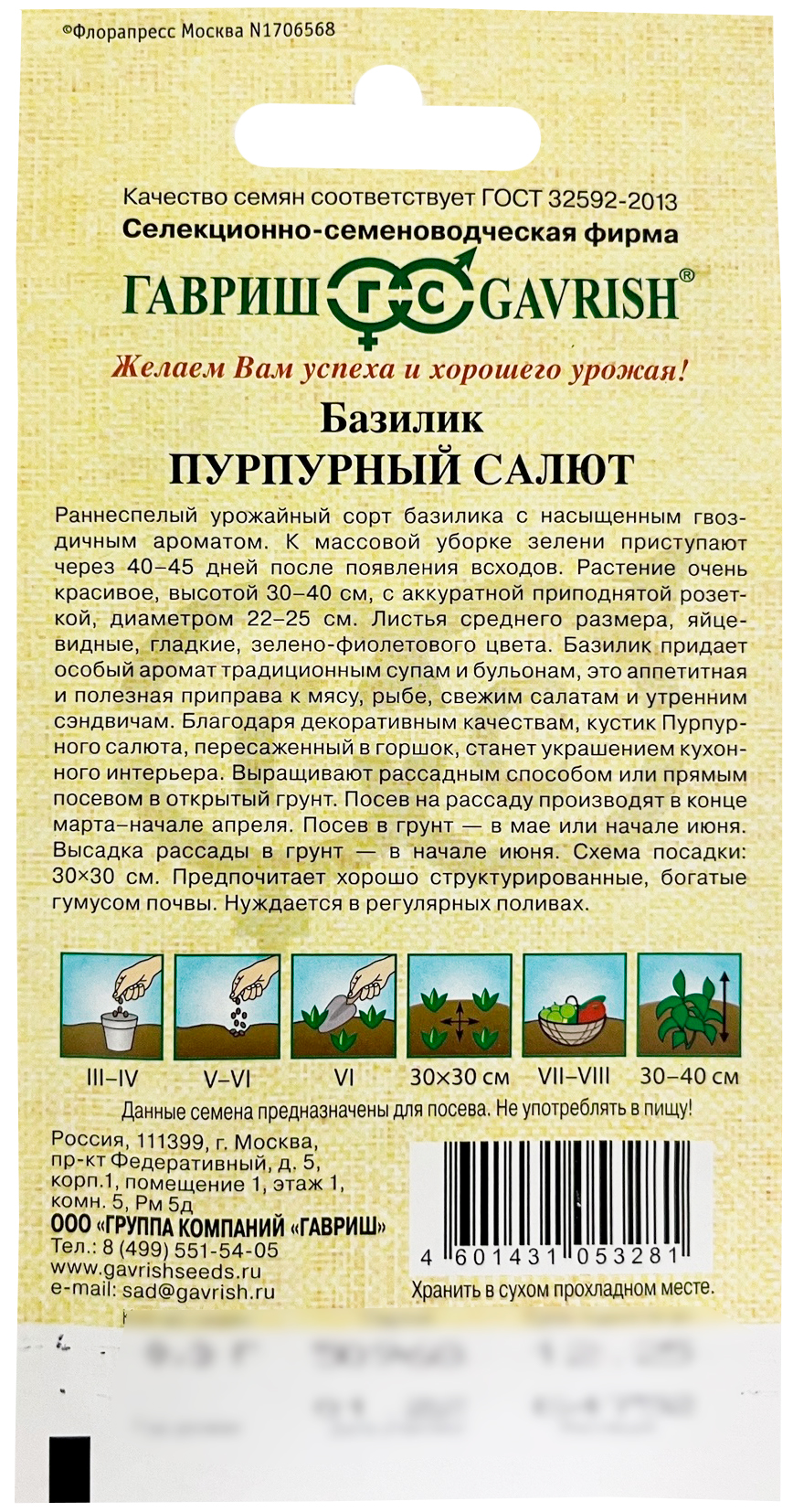 Базилик Пурпурный салют ГАВРИШРаннеспелый урожайный сорт базилика с насыщенным гвоздичным ароматом. К массовой уборке зелени приступают через 40-45 дней после появления всходов. Растение очень красивое, высотой 30-40 см, с аккуратной приподнятым розеткой, диаметром 22-25 см. Листья среднего размера, яйцевидные, гладкие, зелено-фиолетового цвета. Базилик придает особый аромат традиционным супам и бульонам, это аппетитная и полезная приправа к мясу, рыбе, свежим салатам и утренним сэндвичам. Благодаря декоративным качествам, кустик Пурпурного салюта, пересаженный в горшок, станет украшением кухонного интерьера. Выращивают рассадным способом или прямым посевом в открытый грунт. Посев на рассаду производят в конце марта – начале апреля. Посев в грунт — в мае или начале июня. Высадка рассады в грунт – начало июня. Схема посадки: 30x30 см. Предпочитает хорошо структурированные, богатые гумусом почвы. Нуждается в регулярных поливах.