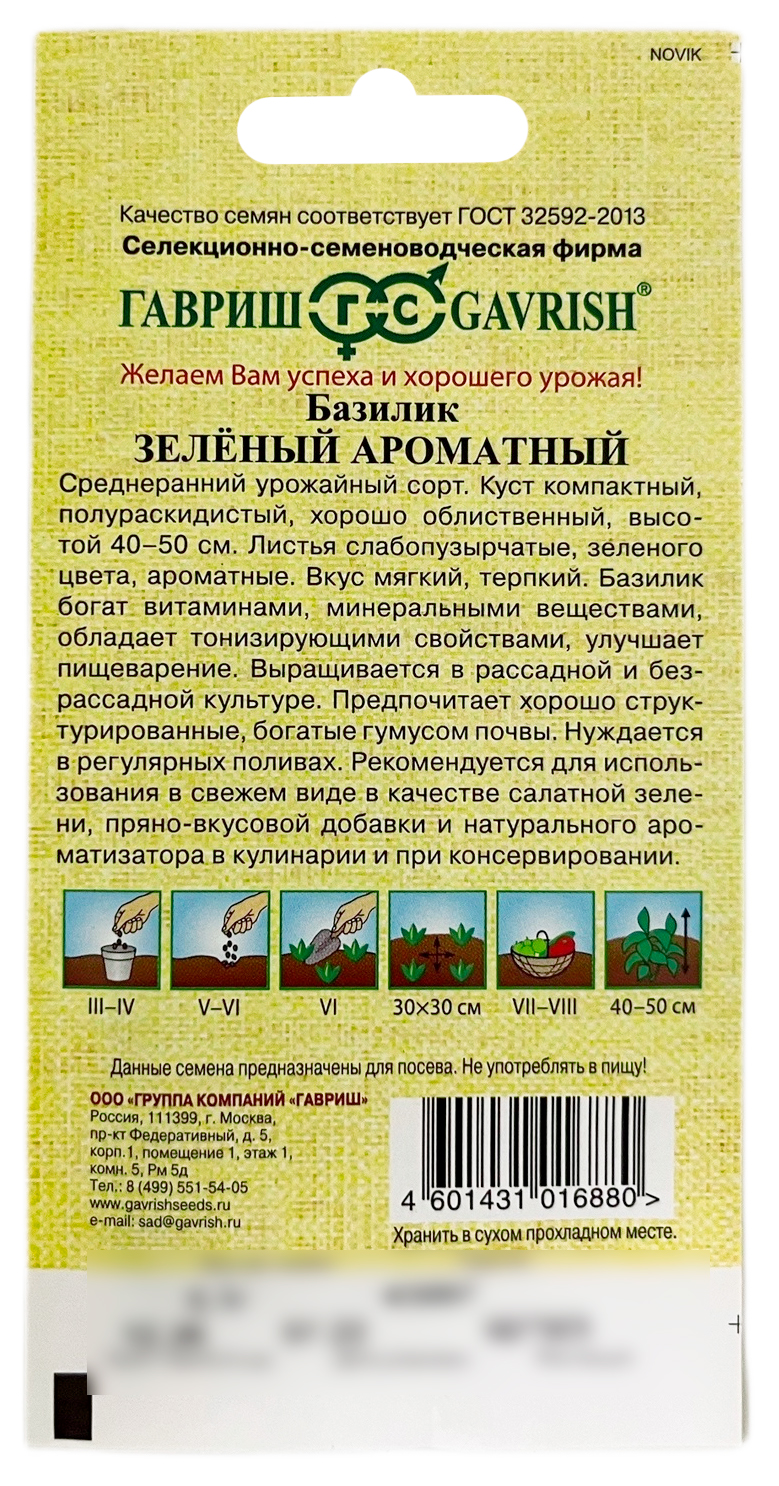 Базилик Зеленый ароматныйСреднеранний урожайный сорт. Куст компактный, полураскидистый, хорошо облиственный, высотой 40-50 см. Листья миниатюрные, слабопузырчатые, зеленого цвета, ароматные. Вкус мягкий, терпкий. Базилик богат витаминами, минеральными веществами, обладает тонизирующими свойствами, улучшает пищеварение. Выращивается в рассадной и безрассадной культуре. Посев на рассаду производят в конце марта – начале апреля. Посев в грунт в мае или начале июня. Высадка рассады в грунт – начало июня. Схема посадки 30x30 см. Предпочитает хорошо структурированные, богатые гумусом почвы. Нуждается в регулярных поливах. Рекомендуется для использования в свежем виде в качестве салатной зелени, пряно-вкусовой добавки и натурального ароматизатора в кулинарии и при консервировании.