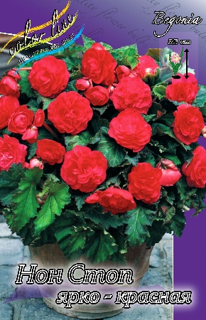 Бегония — одно из самых популярных декоративно-цветущих и декоративно-лиственных растений. Бегонии цветут обильно и ярко, их роскошные цветки напоминают розы, гвоздики, камелии, пионы. Многочисленные нарядные цветки бегоний украшают сады с июня до сентября, а квартиры и защищённые от заморозков балконы ещё дольше - с конца весны до поздней осени. Бегония Нон Стоп ярко-Красная- высота куста до 20 см, с 4-6 одновременно цветущими красивыми махровыми красными цветками, которые достигают в диаметре 8-9 см. Цвет листьев ярко-зеленый. Цветет все лето.Характеристики