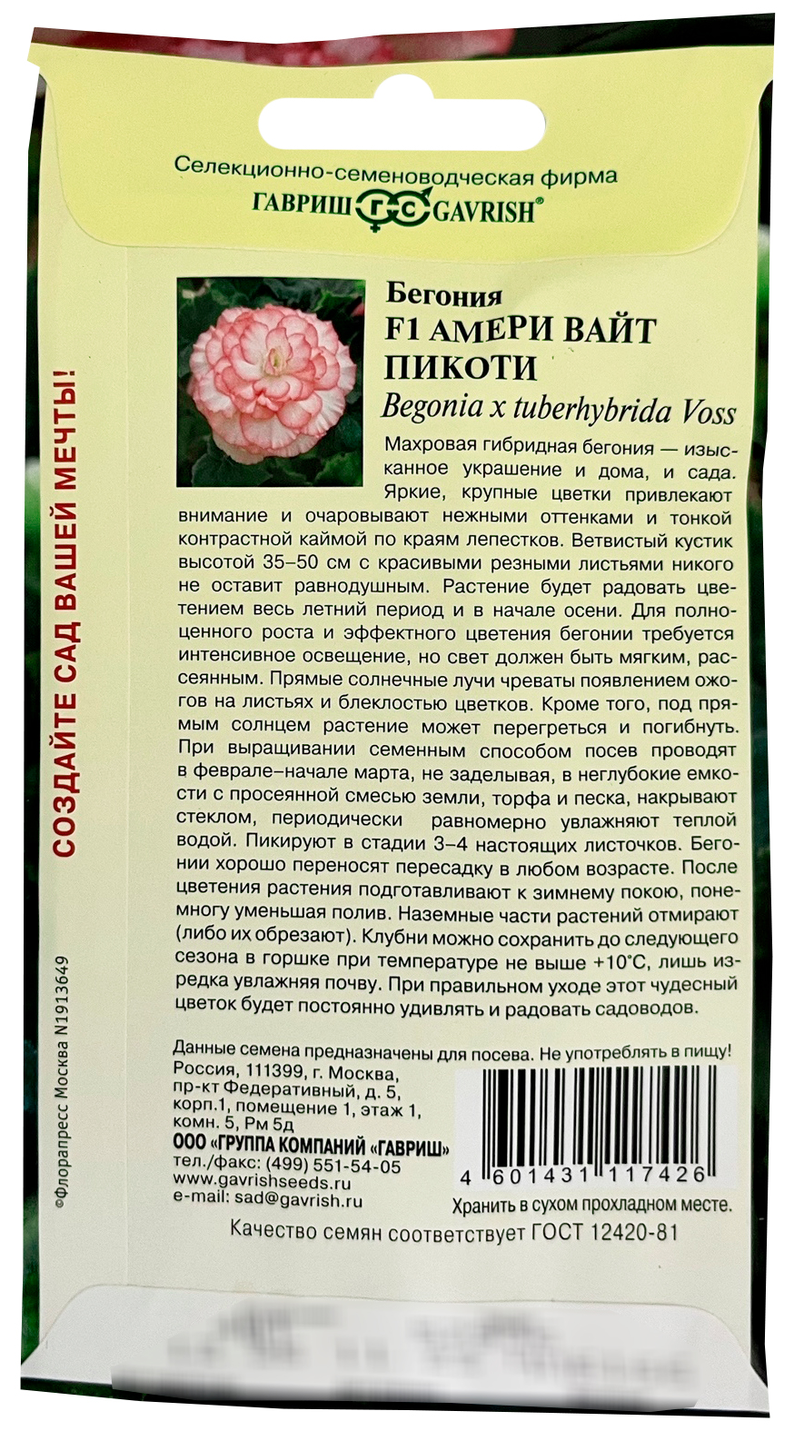 Бегония Амери вайт пикоти F1Махровая гибридная бегония – изысканное украшение и дома, и сада. Яркие, крупные цветки привлекают внимание и очаровывают нежными оттенками и тонкой контрастной каймой по краям лепестков. Ветвистый кустик высотой 35-50 см с красивыми резными листьями никого не оставит равнодушным. Растение будет радовать цветением весь летний период и в начале осени. Для полноценного роста и эффектного цветения бегонии требуется интенсивное освещение, но свет должен быть мягким, рассеянным. Прямые солнечные лучи чреваты появлением ожогов на листьях и блеклостью цветков. Кроме того, под прямым солнцем растение может перегреться и погибнуть. При выращивании семенным способом посев проводят в феврале-начале марта, не заделывая, в неглубокие емкости с просеянной смесью земли, торфа и песка, накрывают стеклом, периодически равномерно увлажняют теплой водой. Пикируют в стадии 3-4 настоящих листочков.
