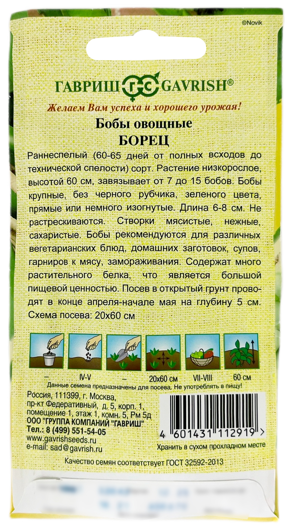 Бобы овощные БорецРаннеспелый (60-65дней от полных всходов до технической спелости) сорт. Растение низкорослое высотой 60 см, завязывает от 7 до 15 бобов. Бобы крупные, без черного рубчика, зеленого цвета, прямые или немного изогнутые. Длина 6-8 см. Не растрескиваются. Створки мясистые, нежные, сахаристые. Бобы рекомендуются для различных вегетарианских блюд, домашних заготовок, супов, гарниров к мясу, замораживания. Содержат много растительного белка, что является большой пищевой ценностью. Посев в открытый грунт проводится в конце апреля-начале мая, на глубину 5 см. Схема посева: 20x60 см