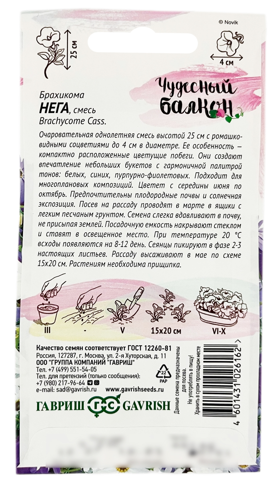 Брахикома НЕГА смесь ГАВРИШОднолетник высотой 25-30 см. Сильноветвистое растение с изящными листьями и звездчатыми соцветиями-корзинками диаметром 3-4 см. Цветки голубые, розовые, белые, фиолетовые и синие. Обильно цветет с середины июня по октябрь. Предпочитает плодородные, хорошо дренированные почвы и солнечные места. Посев на рассаду проводят в марте в ящики с легким песчаным грунтом. Семена слегка вдавливают в почву, не присыпая землей. Посадочную емкость накрывают стеклом и ставят в освещенное место. При температуре +20 °С всходы появляются на 8-12 день. Сеянцы пикируют в фазе 2-3 настоящих листьев. Рассаду высаживают в мае по схеме 15-20 см. Для лучшего ветвления верхушки молодых растений прищипывают. Применяется для оформления клумб, рабаток, бордюров, альпийских горок, как горшечная культура.