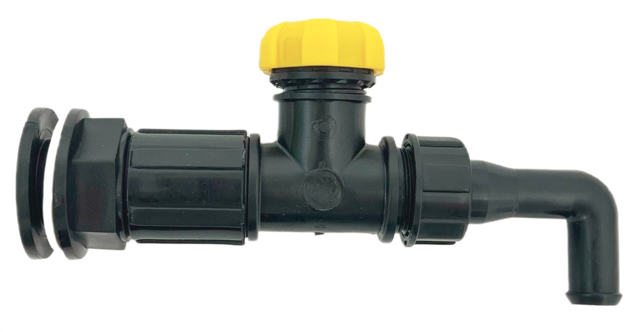 В небольшой емкости сверлится отверстие диаметром 26 мм, затем в это отверстие изнутри вставляется штуцер с прокладкой, и снаружи фиксируется гайкой. Далее при помощи муфты подсоединяется кран 3/4 с переходником.