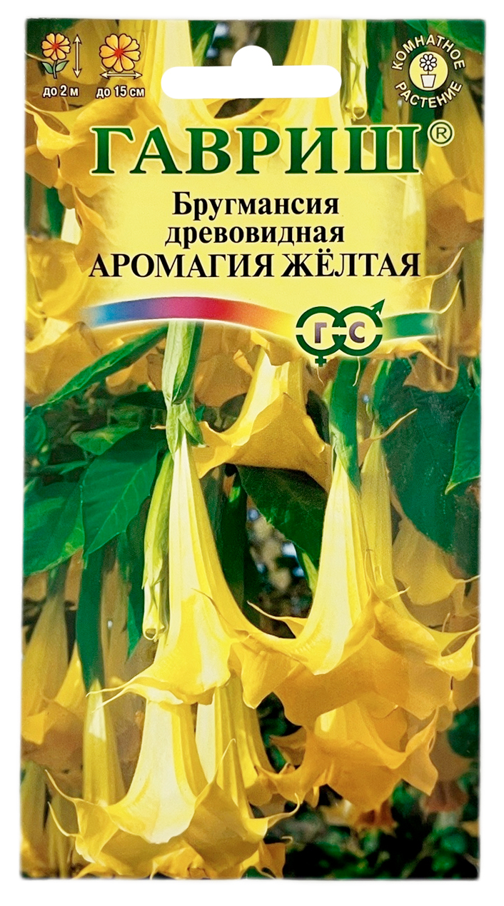 Бругмансия древовидная ангельские трубы АРОМАГИЯ ЖЁЛТАЯ ГАВРИШМощное, очень красивое растение с пышным цветением из семейства Пасленовые. В умеренных широтах вырастает до 2 м. Гигантские трубчато-колокольчатые цветки золотистой окраски достигают в длину до 30 см, в диаметре до 15 см, обладают сильным приятным ароматом, особенно в ночное время. Листья яйцевидные, достаточно крупные, длиной 20-30 см, ярко-зеленого цвета. Бругмансия хорошо переносит заморозки до -5С°, прекрасно подойдет для выращивания в кадках, которые зимой можно разместить в большом светлом помещении или зимнем саду. Семена высевают на рассаду в январе-марте (при наличии дополнительного освещения - круглый год). Посев производят в легкую сыпучую почву на глубину 0,5-1,0 см, после умеренного полива, емкости накрывают прозрачной пленкой и ставят в теплое место с достаточно ярким, но рассеянным светом. Семена прорастают до 1,5 месяцев.