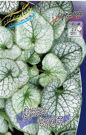 Бруннера крупнолистная "Джек Фрост" - один из самых любимых садоводами сортов бруннеры. Многолетнее травянистое корневищное растение высотой 40-60 см. Листья бруннеры довольно крупные, сердцевидной формы, морозно-серебристой окраски, с зелеными жилками и краем листовой пластины. Листья слегка опушенные, на длинных стеблях, отходящих непосредственно от корня растения.Характеристики