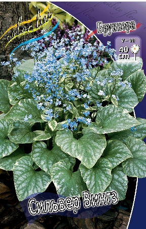 Бруннера Сильвер Вингз относится к группе травянистый многолетник, семейство лютиковых. Куст раскидистый, стебли шершаво-опушенные, облиственные, высотой 35-45 см. Листья продолговатые, сердцевидные с острой верхушкой, сверху темно-зеленые, снизу сероватые. Цветки зеленые листья с серебристым налетом, цветки-голубые . Почва: питательной, умеренно увлажненной. .Месторасположение:солнечное местоположение или полутень, зимостойки. Цветение: в конце апреля - начале мая и длится около месяца. Размножение: делением корневищ, отрезками корневищ и посевом семян. Использование: для оформления задних планов миксбордеров, групп, массивов, лент, одиночно. Растение зимостойко до -29С.Характеристики