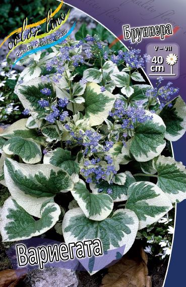 Бруннера крупнолистная "Вариегата" (Brunnera macrophylla 'Variegata') - многолетнее корневищное растение для тенистых участков сада. Размер взрослого растения до 30 см. Крупные листья имеют форму сердца. Листовая пластина слегка морщинистая, с темно зеленой серединой и широкой, кремово-белой полосой по краю.Характеристики