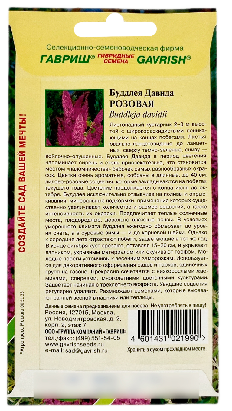 Буддлея ДАВИДА РОЗОВАЯ ГАВРИШЛистопадный кустарник 2-3 м высотой с широко раскидистыми поникающими на концах побегами. Листья овально-ланцетовидные до ланцетных, сверху темно-зеленые, снизу- войлочно-опушенные. Буддлея Давида в период цветения напоминает сирень и столь привлекательна, что становится местом «паломничества» бабочек самых разнообразных окрасок. Цветки очень ароматные, собраны в длинные, до 40 см лилово-розовые соцветия, которые закладываются на побегах текущего года. Цветение продолжается с конца июля-до октября. Буддлея исключительно отзывчива на поливы и опрыскивания, минеральные подкормки, применение которых существенно увеличивает количество и размер соцветий, а также интенсивность их окраски. Предпочитает тёплые, солнечные места, плодородные, довольно влажные почвы. В условиях умеренного климата буддлея ежегодно обмерзает до уровня снега, а в суровые зимы – и до корневой шейки. Однако к середине лета отрастают побеги, зацветающие в тот же год. В конце октября куст срезают, оставляя 15-20 см, и укрывают лапником, укрывным материалом или окучивают торфом. Молодые побеги устойчивы к весенним заморозкам. Используется для декоративного оформления садов и парков, одиночных групп на газоне. Прекрасно сочетается с низкорослыми жасминами, спиреями, многолетними цветочными культурами. Зацветает, начиная с трехлетнего возраста. Увядшие соцветия регулярно удаляют. Размножаются семенами, которые высевают ранней весной в парники и теплицы.
