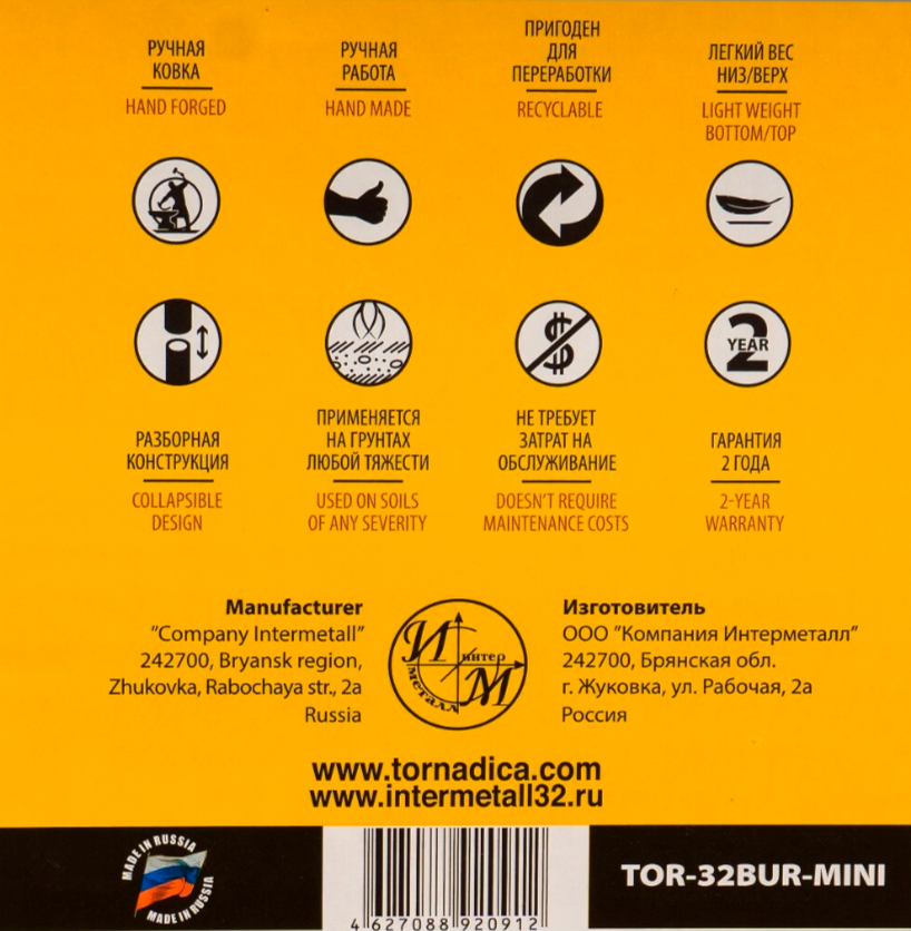 БУР Tornadica MINII, состоит из рабочего органа, в виде металлического шнека, длиной 14 cм и толщиной 2 мм, спиралеобразного наконечника, изготовленного из конструкционной стали, с применением закалки и ручной ковки. Благодаря этому, шнек бура приобретает высокую прочность и долговечность использования, высокую эффективность в применении.