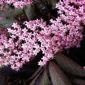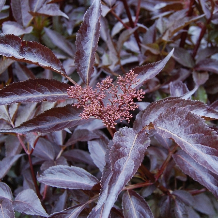Бузина чёрная Блэк Бьюти Sambucus nigra Black Beauty© Быстрорастущий кустарник. Годовой прирост 50см. Цветёт светло-розовыми цветками, собранными в щитковидные соцветия, в июне-июле. Красные мелкие, съедобные плоды созревают в середине летаХарактеристики