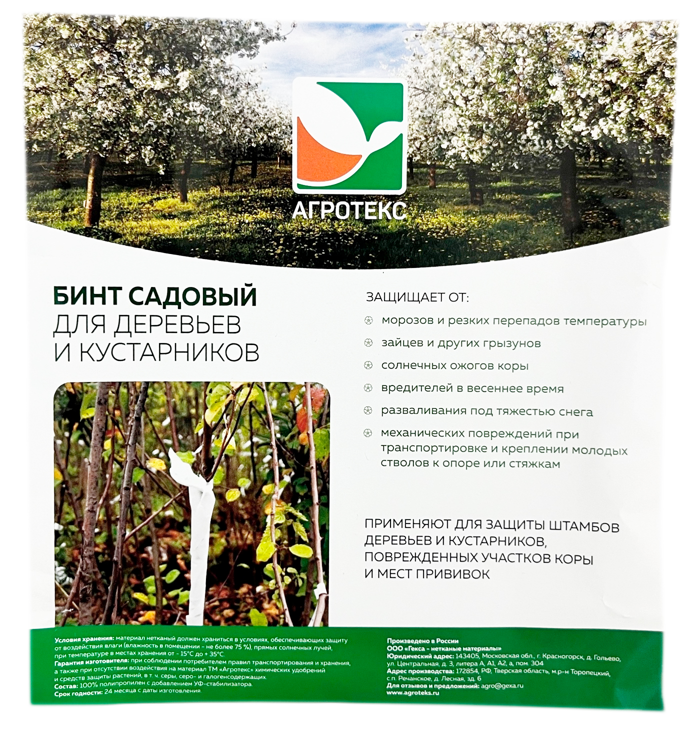 Бинт садовый изготовлен из нетканого материала, который пропускает воздух, не задерживает воду и отражает прямые солнечные лучи. Это позволяет надёжно защитить стволы молодых деревьев от морозов и солнечных ожогов.