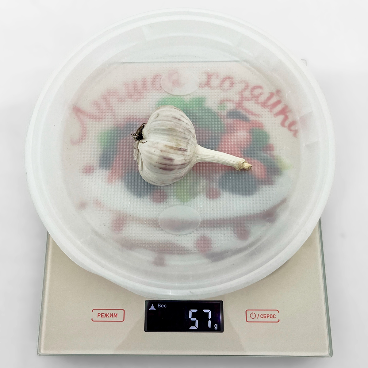 Луковицы по форме округлые, крупные, массой до 65 г, каждая имеет по 10-14 зубков. Сухие чешуйки серовато-белые, жилки фиолетовые. Мякоть светло-кремовая, почти белая.