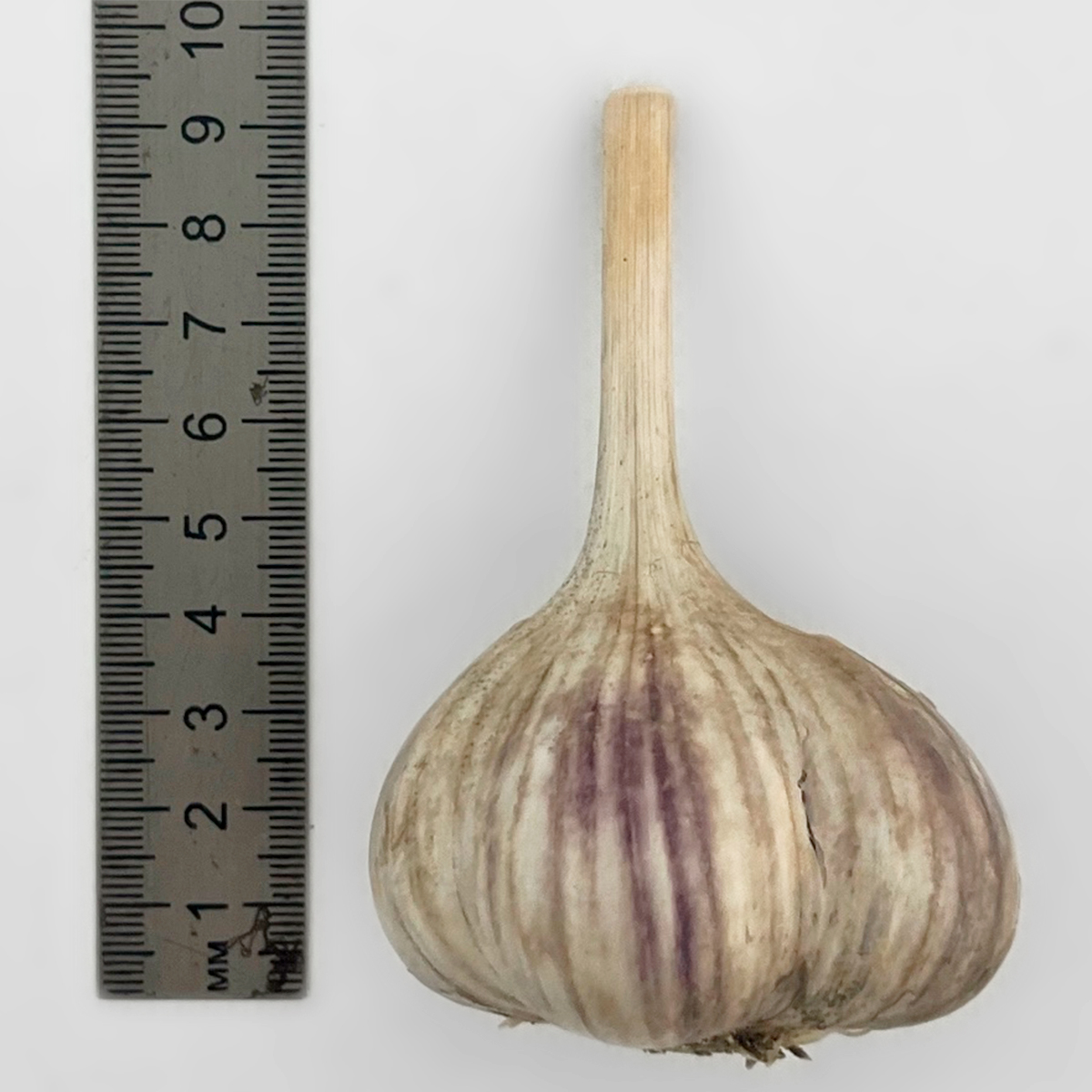Луковица имеет округло-плоскую форму и массу до 100 граммов. Количество зубков 7, размеры крупные – массой до 25 граммов каждый. Мякоть белая, плотная и хрустящая. Вкус острый.