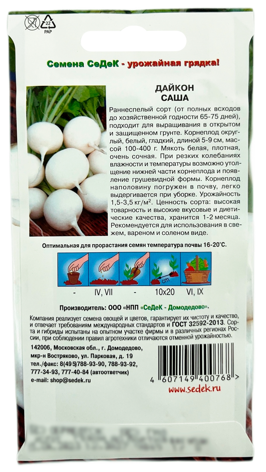 Дайкон СашаРаннеспелый сорт (от полных всходов до хозяйственной годности 65-75 дней), подходит для выращи-вания в открытом и защищенном грунте. Корнеплод округлый, белый, гладкий, длиной 5-9 см, массой 100-400 г. Мякоть белая, плотная, очень сочная. При резких колебаниях влажности и температуры воз-можно утолщение нижней части корнеплода и появление грушевидной формы. Корнеплод наполовину погружен в почву, легко выдергивается при уборке. Урожайность 1,5-3,5 кг/м2. Ценность сорта: высокая товарность и высокие вкусовые и диетические качества, храниться 1-2 месяца. Рекомендуется для использования в свежем, вареном и соленом виде.Оптимальная для прорастания семян температура почвы 16-20°С.