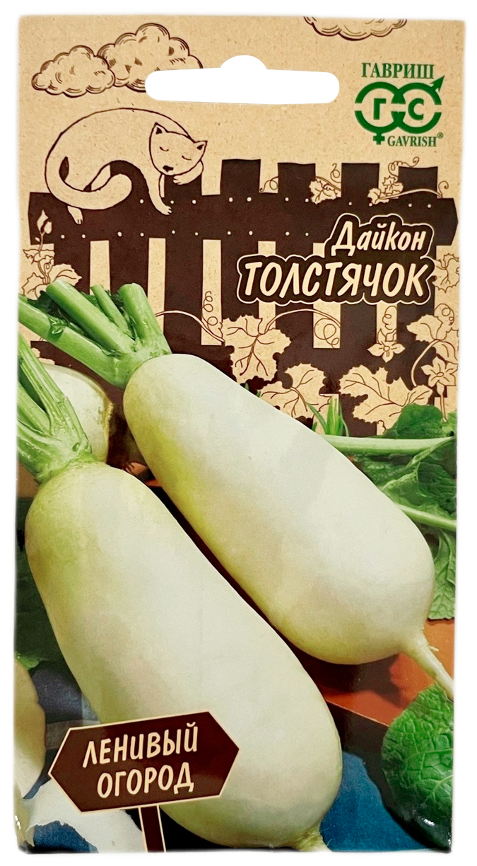 Дайкон Толстячок Ленивый огород ГАВРИШРаннеспелый сорт 45-50 дней от всходов до сбора урожая. Корнеплод белоснежный, цилиндрический с гладкой поверхностью длиной 17-20 см, массой 530-550 г. Мякоть без грубых волокон, сладкая, сочная, хрустящая, совсем без острого привкуса. Прекрасно подходит для употребления в свежем виде и непродолжительного хранения. Семена высевают в открытый грунт в конце апреля-мае или во второй половине июля по схеме 8-10х20 см.