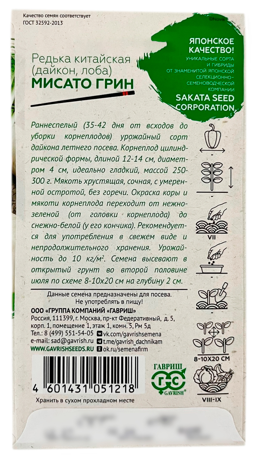 Редька китайская (Дайкон) Мисато Грин (Саката) ГАВРИШРаннеспелый (35-42 дня от всходов до уборки корнеплодов) урожайный сорт дайкона летнего посева. Корнеплод цилиндрической формы, длиной 12-14 см, диаметром 4 см, идеально гладкий, массой 250-300 г. Мякоть хрустящая, сочная, с умеренной остротой без горечи. Окраска коры и мякоти корнеплода переходит от нежно-зеленой (от головки корнеплода) к снежно-белой (у его кончика). Рекомендуется для употребления в свежем виде и непродолжительного хранения. Урожайность до 10 кг/м2. Семена высевают в открытый грунт во второй половине июля по схеме 8-10 х 20 см на глубину 2 см.