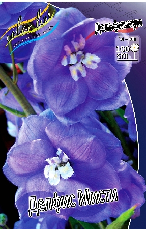 Дельфиниум Делфиз Мисти многолетние растение.Цветок: синий с кремовым центром махровый.высота 100 см. Начало цветения дельфиниума - конец июня, когда уже отцвели пионы и многие ирисы, а июльское буйство цветов ещё не началось. В это время дельфиниум - король цветов в саду.Солнечное защищенное от ветров место, плодородная, хорошо дренируемая почва, подвязка к опоре и регулярный полив обеспечат буйное цветение.Характеристики