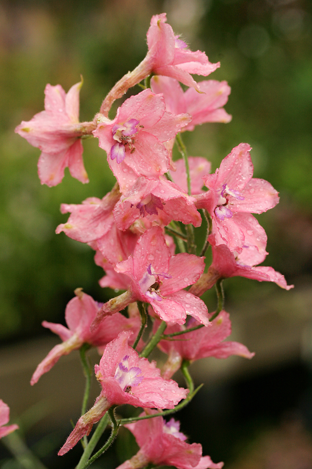 Дельфиниум: традиционное садовое растение. Цветки разных оттенков синего, белые, розовые, собраны в плотные, большие, свечевидные слаборазветвленные кисти. Листья пальчатые, светло-зеленые. Образует прямые кусты высотой 80-140 см. Цветки подходят для срезки. Если обрезать его сразу после окончания цветения, позже он зацветает еще раз в том же сезоне.Пинк Сенсэйшн: цветки простые, розовые с белым глазком, 2 см в диаметре, собраны в конические соцветия 70 - 80 см длиной.