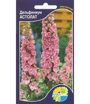 Дельфиниум Астолат. Многолетнее растение семейства Лютиковые, высотой до 2 м с плотными кистевидными соцветиями розовых, малиново-розовых и розово-красных с темным глазком цветков. Цветет в июне-июле, вторичное цветение - в августе-сентябре, отцветшие соцветия обрезают для полноценного второго цветения. Семена высевают осенью в открытый грунт или в марте на рассаду, в мае растения высаживают на постоянное место с расстоянием 35-40 см. Используются в групповых и одиночных посадках, для получения срезки. В срезанном виде стоят в воде до 10-12 дней. Все части дельфиниума ядовиты. Хорошо растет на освещенных участках с легким затенением в полуденные часы. Предпочитает плодородные суглинистые и супесчаные, умеренно влажные почвы.Характеристики