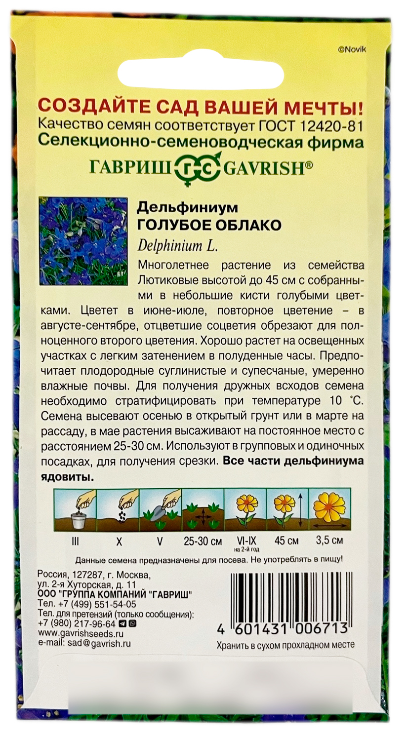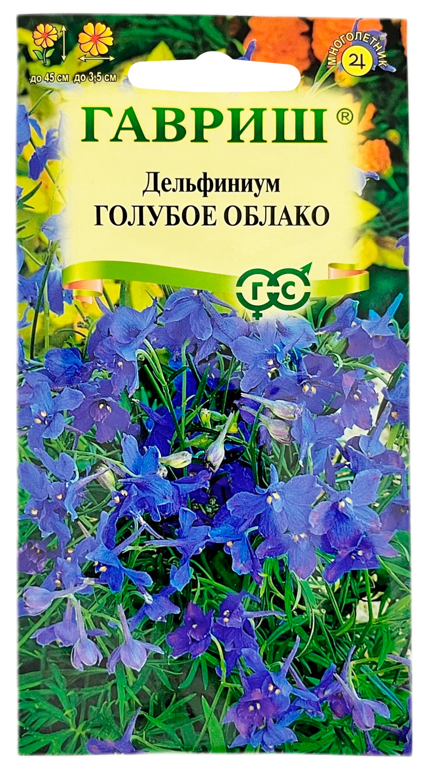 Дельфиниум ГОЛУБОЕ ОБЛАКО ГАВРИШМноголетнее растение семейства Лютиковые, высотой до 50 см с собранными в небольшие кисти голубыми цветками. Цветет в июне-июле, вторичное цветение - в августе-сентябре, отцветшие соцветия обрезают для полноценного второго цветения. Хорошо цветет на освещенных участках с легким затенением в полуденные часы. Предпочитает плодородные суглинистые и суперпесчанные, умеренно-влажные почвы. Семена высевают осенью в открытый грунт или в марте на рассаду, в мае растения высаживают на постоянное место с расстоянием 35-40 см. Используются в групповых и одиночных посадках для получения срезки. Все части растения ядовиты.
