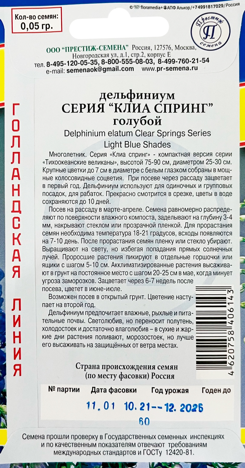 Дельфиниум Клиа спринг голубой 0,05г семена