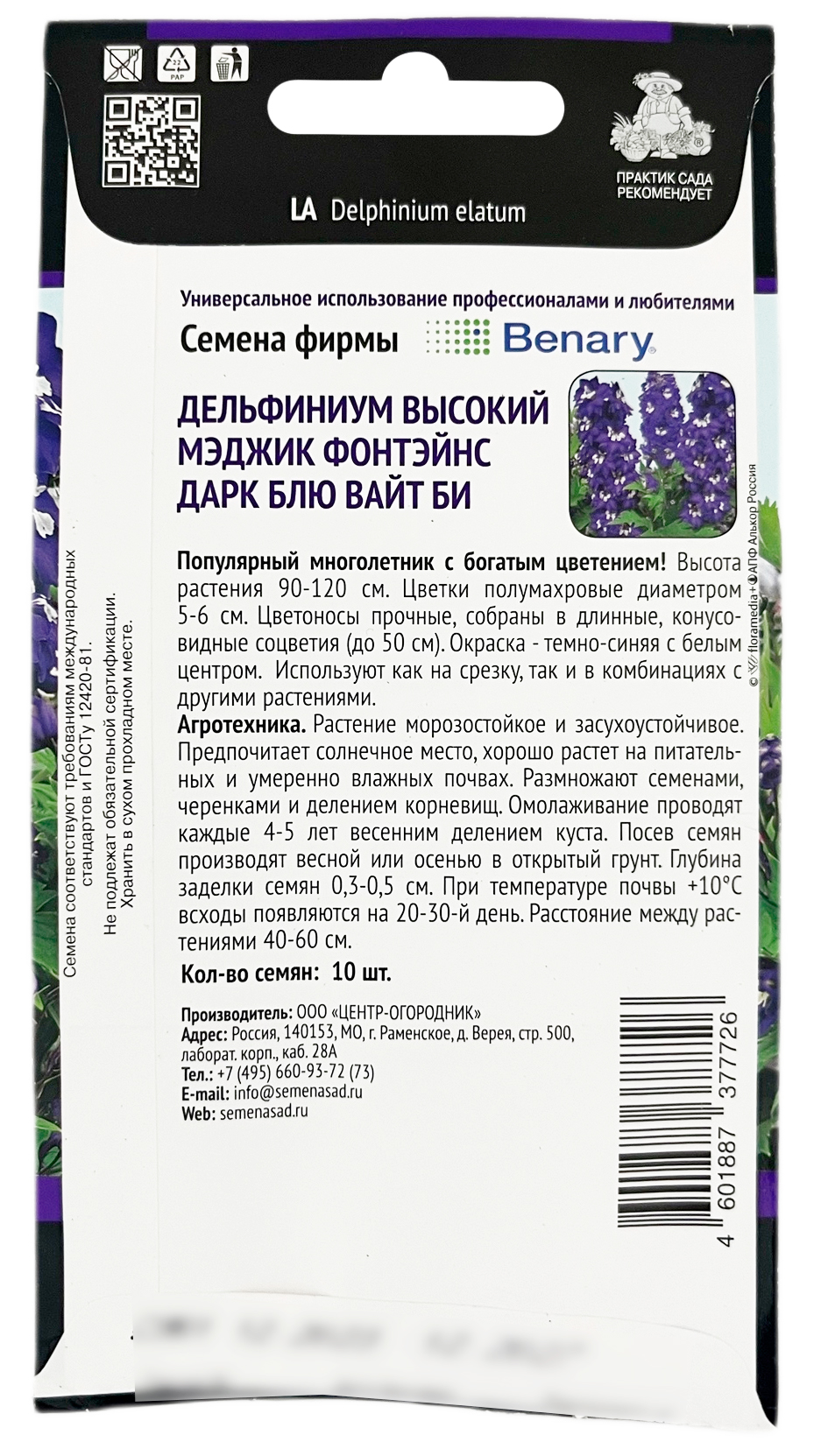 Дельфиниум высокий МЭДЖИК ФОНТЭЙНС ДАРК БЛЮ ВАЙТ БИ ПОИСКПопулярный многолетник с богатым цветением! Высота растения 90-120 см. Цветки полумахровые диаметром 5-6 см. Цветоносы прочные, собраны в длинные, конусовидные соцветия (до 50 см). Окраска - темно-синяя с белым центром. Используют как на срезку, так и в комбинациях с другими растениями.