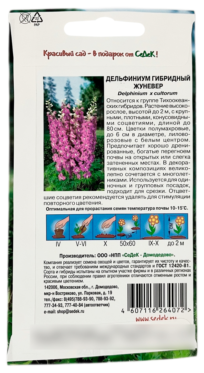 Дельфиниум гибридный ЖУНЕВЕР СеДеКОтносится к группе Тихоокеанских гибридов. Растение высокорослое, высотой до 2 м, с крупными, плотными, конусовидными соцветиями, длиной до 80 см. Цветки полумахровые, до 6 см в диаметре, лилово-розовые с белым центром. Предпочитает хорошо дренированные, богатые перегноем почвы на открытых или слегка затененных местах. В декоративных композициях великолепно сочетается с многолетниками. Используется для одиночных и групповых посадок, подходит для срезки. Отцветшие соцветия рекомендуется удалять для стимуляции повторного цветения.