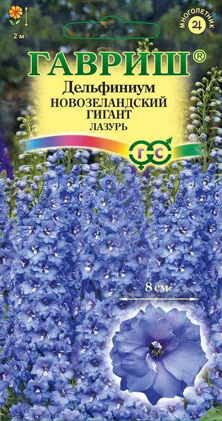Новозеландские гиганты — признанные мировые законодатели селекционной моды среди дельфиниумов. Исключительные декоративные качества, зимостойкость, долговечность и неприхотливость, сделали эти сорта самым желанным приобретением многих профессионалов и садоводов-любителей. Растения рослые, более 2 м, с прочными здоровыми цветоносами, но все же нуждается в опоре. Необыкновенно крупные махровые цветки, лазурного цвета, собраны в плотное, буквально набитое соцветие. Первое цветение происходит на второй год после посева, в июне-июле. Повторное — в августе. Дельфиниумы предпочитают солнечные, защищенные от ветра участки с плодородными нейтральными почвами и хорошим дренажем (не выносит переувлажнения). Семена проращивают слегка присыпав почвой (лучше стерильной). Для получения дружных всходов, посевы рекомендуется выдержать в холодильнике в течение недели. Посевы оберегают от сквозняков и поливают с осторожностью, из распылителя. Всходы появляются при температуре 18-24°С (не допускайте повышения температуры выше 26Характеристики