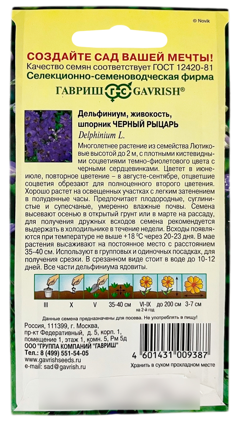 Дельфиниум, живокость, шпорник Черный рыцарь ГАВРИШМноголетнее растение семейства Лютиковые, высотой до 2 м с плотными кистевидными соцветиями темно-фиолетового цвета с черными сердцевинками. Цветет в июне-июле, вторичное цветение – в августе-сентябре, отцветшие соцветия обрезают для полноценного второго цветения. Хорошо растет на освещенных участках с легким затенением в полуденные часы. Предпочитает плодородные суглинистые и супесчаные, умеренно влажные почвы. Семена высевают осенью в открытый грунт или в марте на рассаду, в мае растения высаживают на постоянное место с расстоянием 35-40 см. Используются в групповых и одиночных посадках, для получения срезки. В срезанном виде стоят в воде до 10-12 дней. Все части дельфиниума ядовиты.