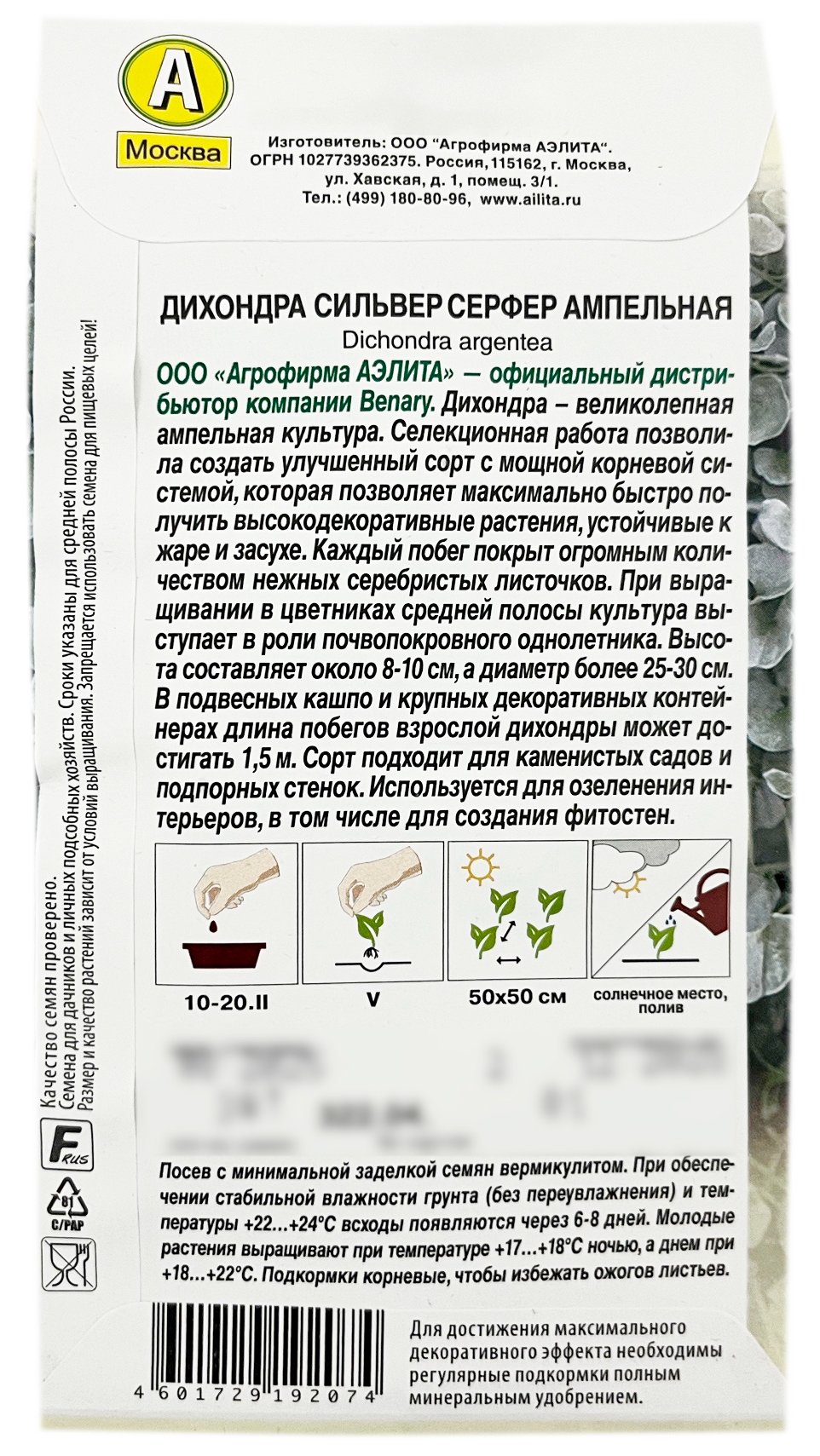 Дихондра СИЛЬВЕР СЕРФЕР ампельная АЭЛИТАДихондра – великолепная ампельная культура. Селекционная работа позволила создать улучшенный сорт с мощной корневой системой, которая позволяет максимально быстро получить высокодекоративные растения, устойчивые к жаре и засухе. Каждый побег покрыт огромным количеством нежных серебристых листочков. При выращивании в цветниках средней полосы культура выступает в роли почвопокровного однолетника. Высота составляет около 8-10 см, а диаметр более 25-30 см. В подвесных кашпо и крупных декоративных контейнерах длина побегов взрослой дихондры может достигать 1,5 м. Сорт подходит для каменистых садов и подпорных стенок. Используется для озеленения интерьеров, в том числе для создания фитостен.